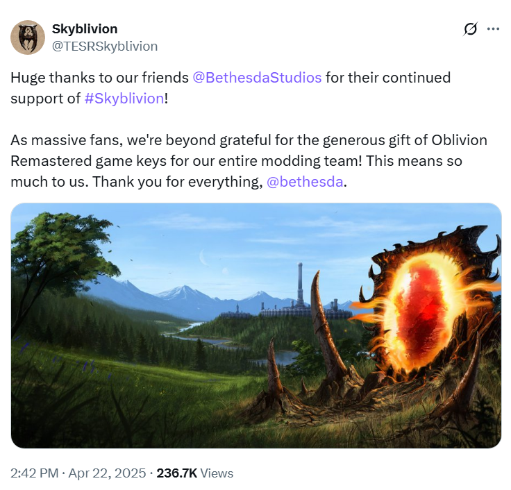 Com o anúncio do Oblivion Remastered pela Bethesda, surgiram preocupações de que o estúdio pudesse pedir o cancelamento do mod para proteger as vendas da nova versão. Mas o time do Skyblivion anunciou nas redes sociais que a Bethesda não apenas apoiou o projeto como também presenteou toda a equipe de modders com chaves gratuitas de Oblivion Remastered.