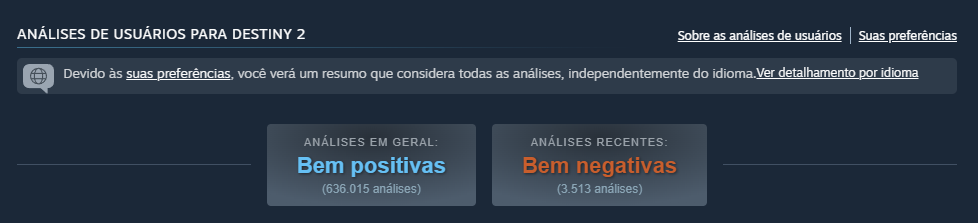 Destiny 2 talvez enseja no seu pior momento na história, com a nota geral na Steam caindo de “bem positivas” para “bem negativas” nos últimos 30 dias, com apenas 31% das reviews recentes sendo favoráveis. Em russo, o cenário é ainda pior: só 9% das análises são positivas, classificando o jogo como “majoritariamente negativas”.