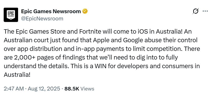 A Epic Games anunciou que vai lançar Fortnite e a Epic Games Store para iOS na Austrália, após uma vitória na Corte Federal que classificou as práticas da Apple e do Google como anticompetitivas.
