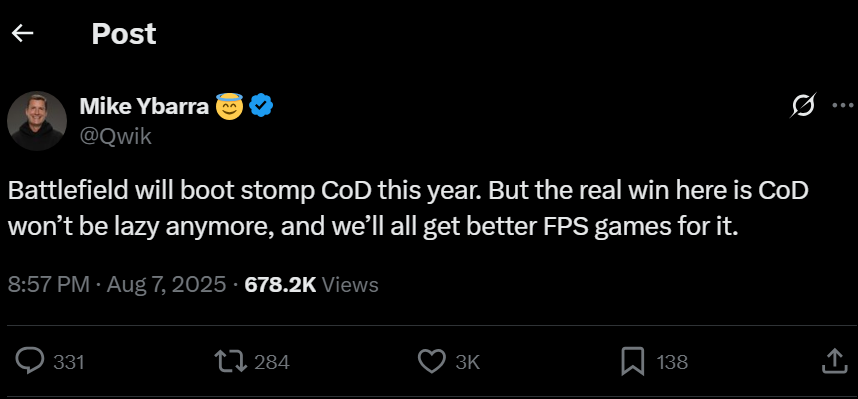 “Battlefield vai esmagar Call of Duty este ano. Mas a verdadeira vitória é que Call of Duty não vai mais ser preguiçoso, e todos nós vamos ter jogos FPS melhores por causa disso”, afirmou Ybarra em postagens na rede X.
