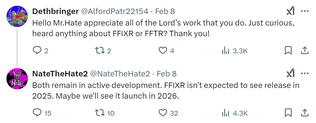 “Ambos continuam em desenvolvimento ativo. Não é esperado que o remake de FFIX seja lançado em 2025. Talvez o vejamos em 2026”, disse Nate ao responder perguntas de fãs sobre o progresso dos jogos.